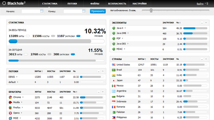 CloseHauptsächlich werden Exploit Kits verwendet, um Malware (Schadsoftware) zu installieren. Zusätzlich zum Exploit Kit gibt es auch Software, die Interfaces beinhaltet, die anzeigen, welche Informationen bearbeitet werden und geben Statistiken darüber wieder.