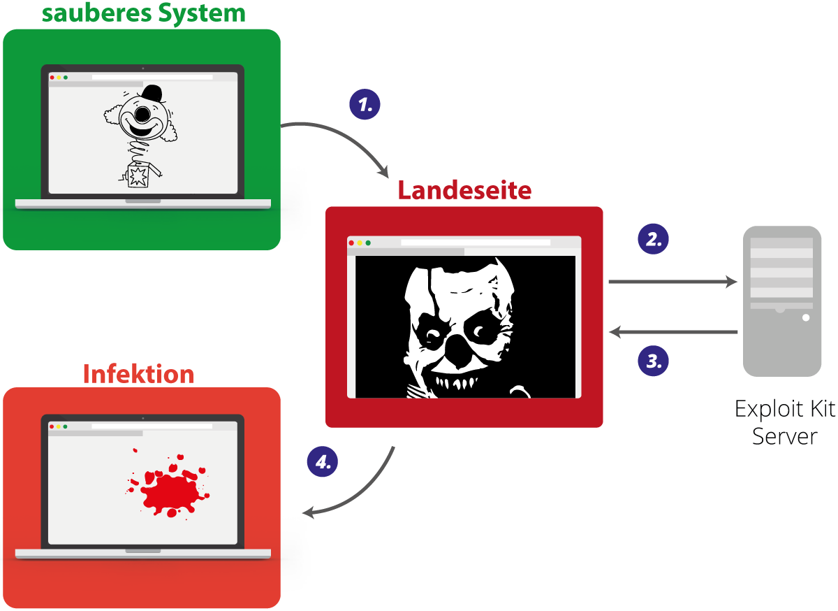 Ein Exploit Kit bekommt durch Anklicken einer manipulierten Seite, eines Links in einer E-Mail oder Fotos im Hintergrund, also für das Opfer unsichtbar, Zugriff auf Informationen wie genutzte Programme und deren Version.