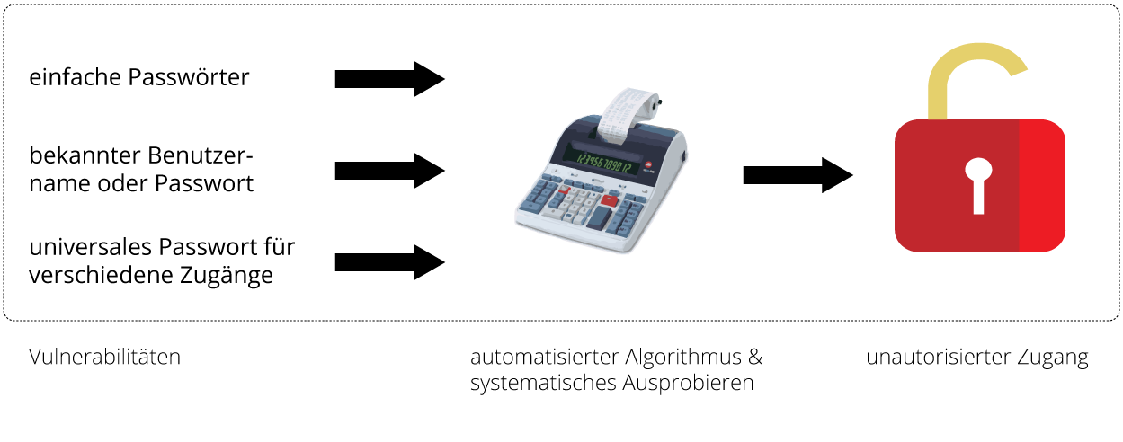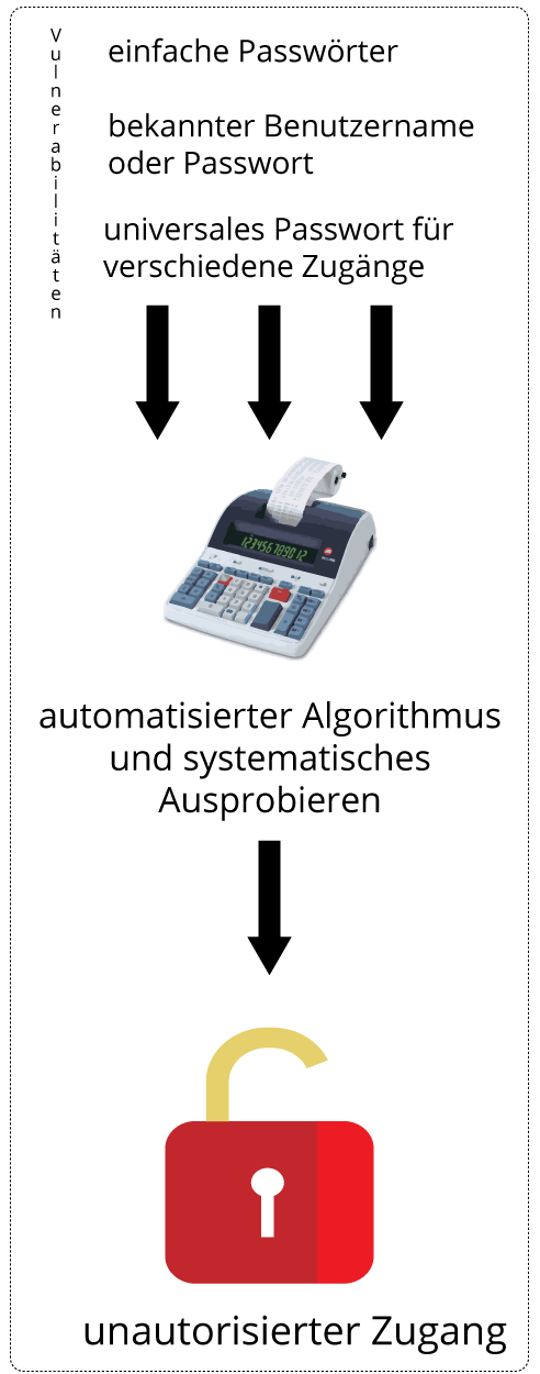 Die “rohe Gewalt” Attacke beschreibt einen Cyberangriff, bei dem durch systematisches Kombinieren von Zeichen Passwörter erraten werden. Das erfolgt dabei nicht per Hand, sondern durch einen automatisierten Algorithmus eines z. B. im Internet kostenfrei erhältlichen Programms. Dieses Programm durchläuft zum Beispiel bei einem Zahlenpasswort mit fester Zeichenanzahl alle möglichen Kombinationen zwischen 000000000 und 999999999 und stoppt erst, wenn das Passwort gefunden wurde. Besonders bei einfachen Passwörtern ist die Wahrscheinlichkeit gegeben, dass die Zugangsdaten erkannt werden. Eine weitere Möglichkeit bieten schon von anderen Seiten illegal erworbene Daten wie Benutzernamen oder E-Mail-Adressen. Folglich hat der Angreifer schon den Benutzernamen oder den Zugang und bessere Bedingungen, die fehlenden Informationen ebenfalls systematisch zu erraten. Die Attacke betrifft dabei nicht nur die Nutzer, sondern auch die Server der Webseite.