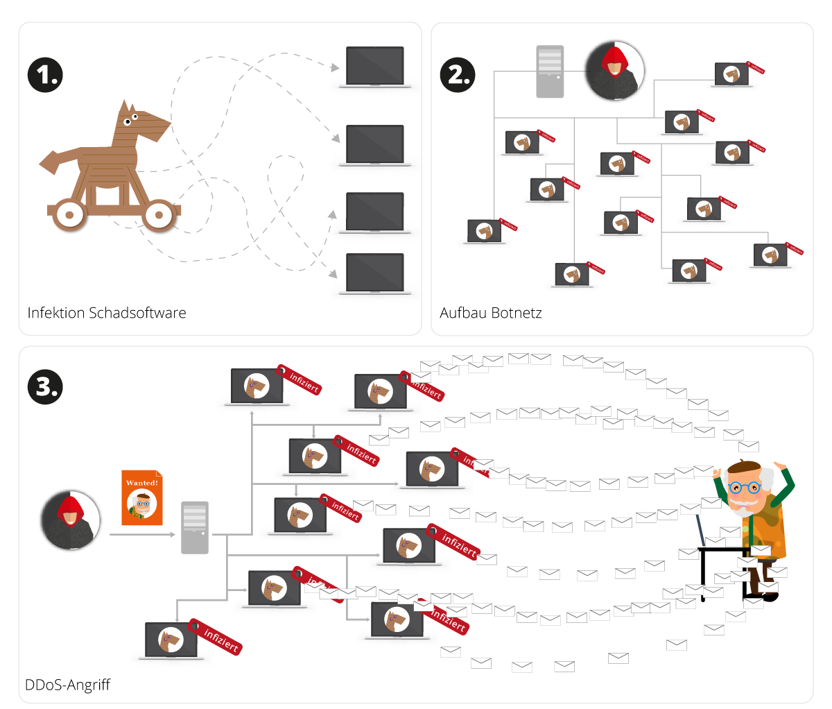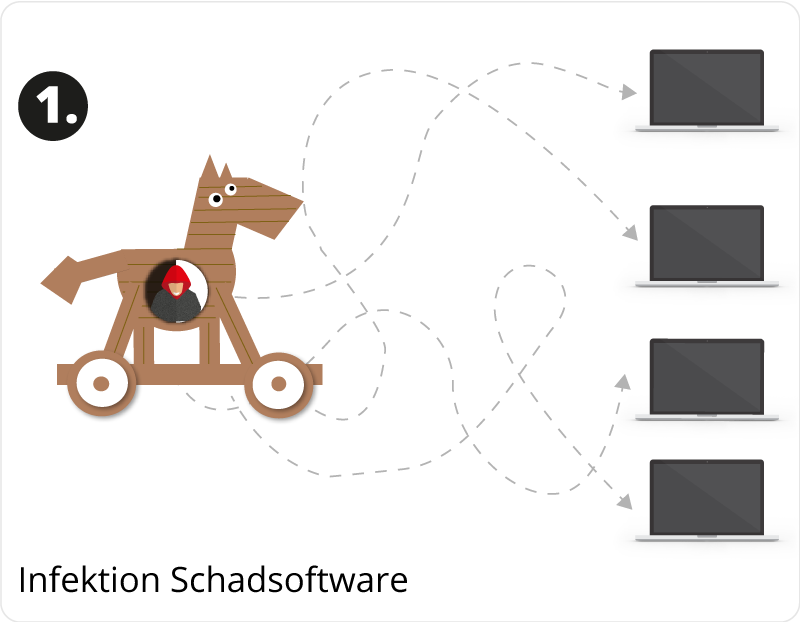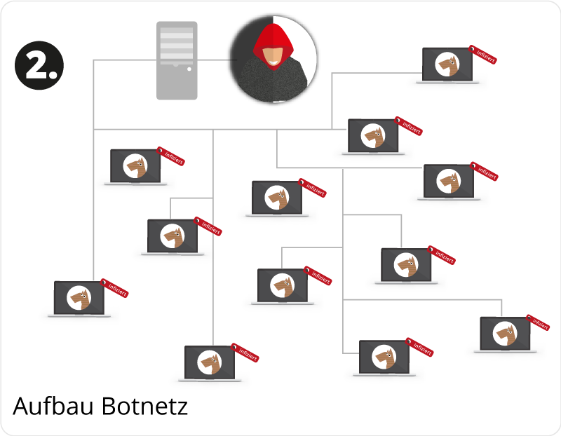 Botnetze (engl. Botnet) sind fast genauso alt wie das Internet und immer noch sehr beliebt bei Hackern. Über verschiedene Einfalltore verschafft sich der Angreifer Zugang zum Computer des Opfers und kann so nicht nur finanziellen Schaden anrichten, sondern auch eine Schadsoftware (Malware, trojanisches Pferd) installieren. Diese Schadsoftware kann zum Beispiel durch das Öffnen von E-Mail-Anhängen, die mit Malware verseucht sind, auf dem Rechner des Opfers gelangen. Sie wird für weitere ferngesteuerte Aktionen im Verbund mit anderen auch infizierten Computern genutzt.