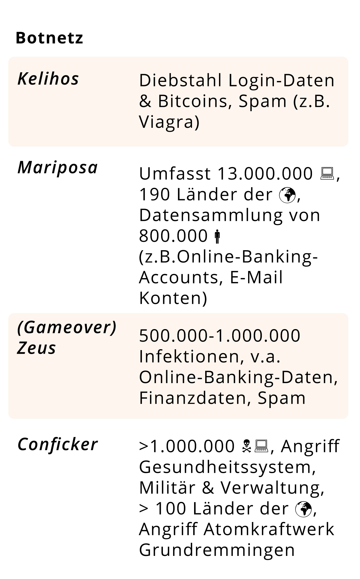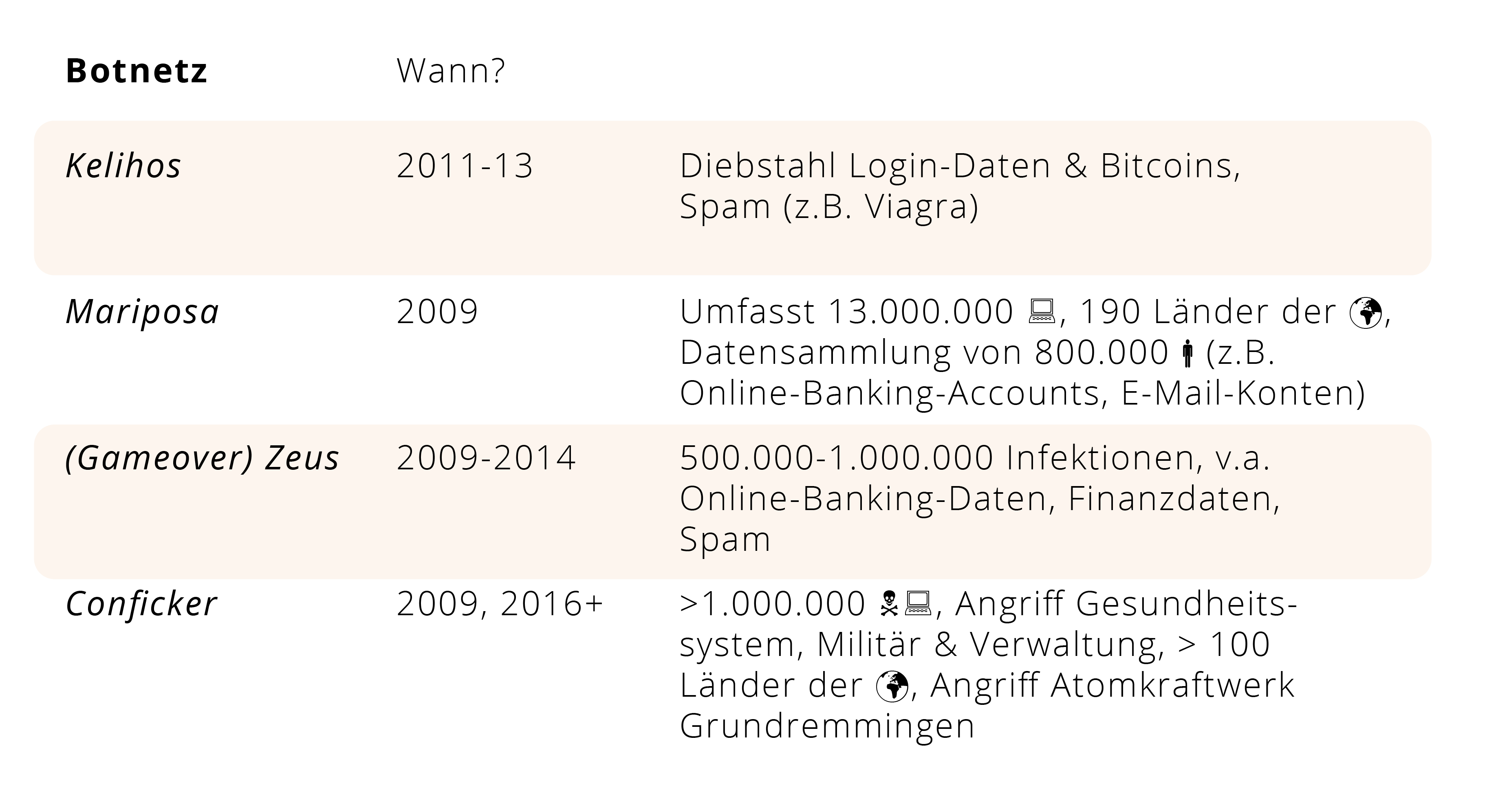 - Botnetze können verschiedene Namen und Ziele haben sowie unterschiedliche Opfer adressieren