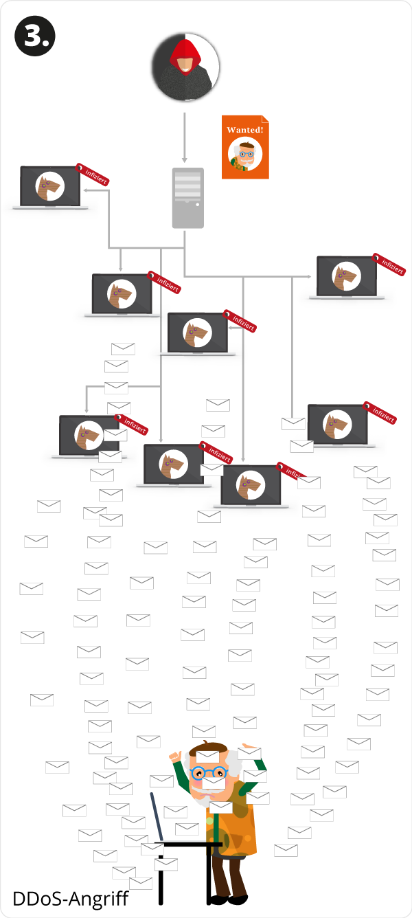 CloseFür eine Attacke im Verbund programmiert der Angreifer die einzelnen Bots im Botnetz so, dass jeder zeitgleich bspw. eine Sicherheitslücke in einem Netzwerk ausnutzt, um Daten auszuspähen (z.B. Unternehmensgeheimnisse) oder Webseiten (DDoS-Angriff) lahmzulegen.
