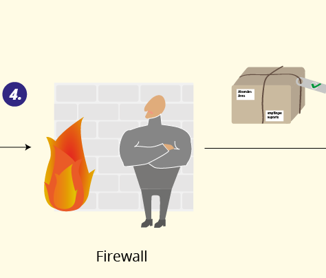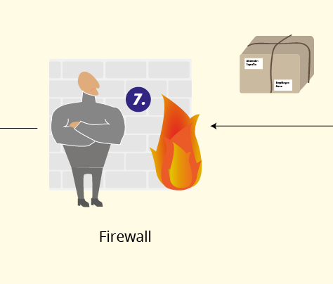 Nach ihm folgt die Firewall ( 4 ), die zusätzlich das nachstehende Netzwerk vor unbefugten Zugriffen oder Anfragen schützt. Sind bestimmte Anfragen nicht auf der Zugangsliste der Firewall, wird die Anfrage, wie bei einem unliebsamen Gast, der nicht auf der Gästeliste steht, durch den Türsteher blockiert.