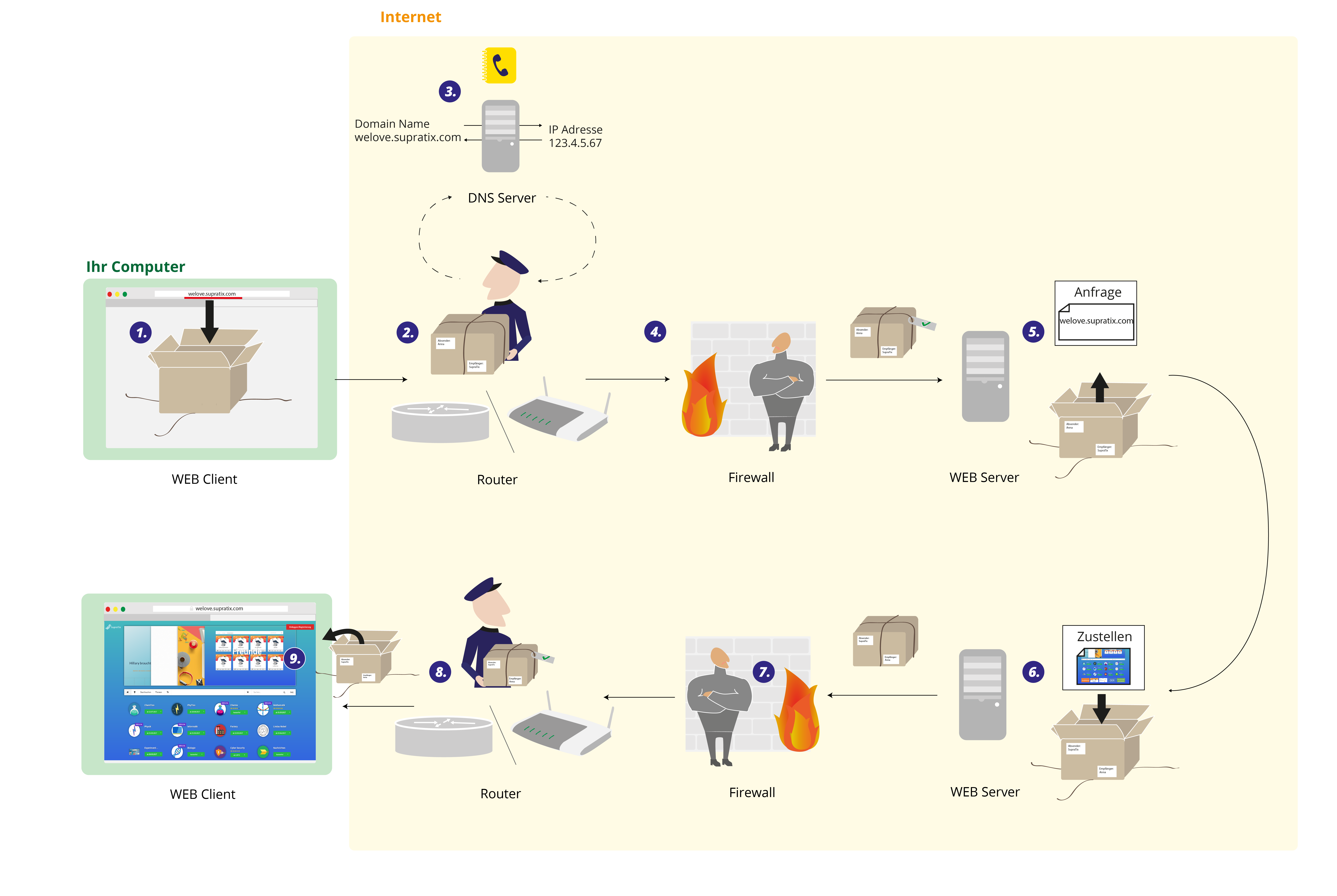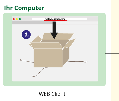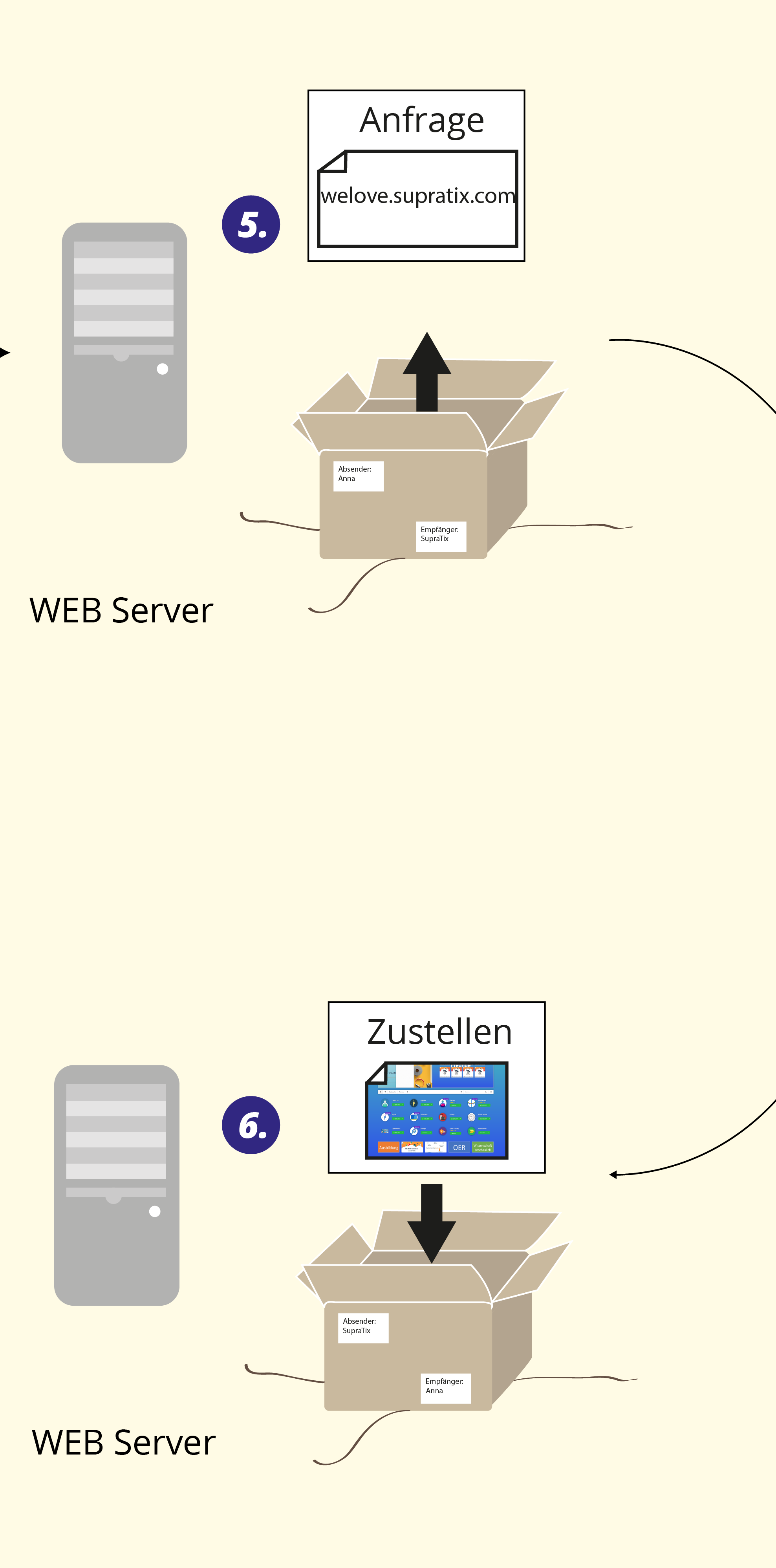 Jedes Mal, wenn im Internet eine Aktion durchgeführt wird, also z. B. die Internetseite der Lernplattform SupraTix abgerufen wird ( 1 ), wird eine Anfrage an den Server gestellt.