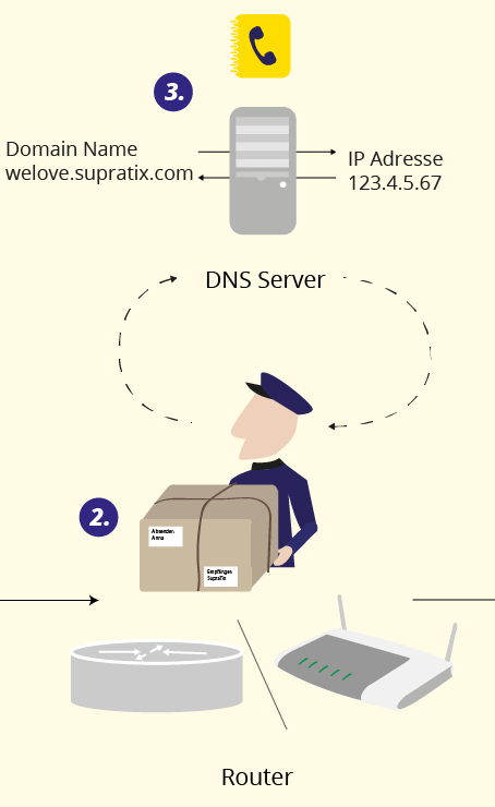 Weiß der Router oder Postbeamte einmal nicht, welche Zieladresse richtig ist, informiert er sich im Telefonbuch des Internets, dem DNS Server ( 3 ), nach der richtigen Adresse. Diese speichert er dann für zukünftige ähnliche Sendungen ab. Außerdem merkt er sich den Absender des Pakets, um für die Rücksendung eine direkte Zustellung zu gewährleisten.