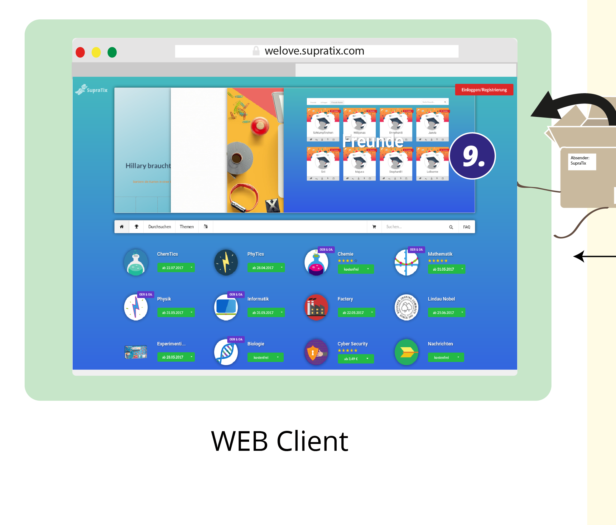 Das ankommende Paket wird entgegengenommen und ausgepackt. Die darin enthaltene Anfrage lautet „Schicken Sie mir bitte die Webseite von SupraTix!“.