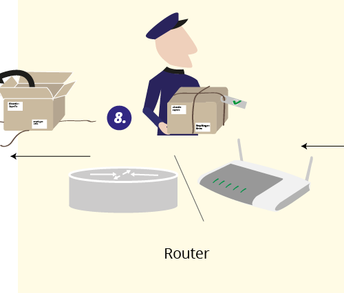 wird zum Postbeamten, dem Router ( 8 ) sowie dem DNS Server ( 3 ) weitergeleitet
